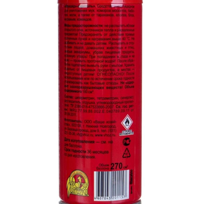 Состав аэрозоля включает в себя следующие активные вещества: циперметрин (0,20%) и тетраметрин (0,18%). Эти компоненты обладают высокой эффективностью в уничтожении насекомых и обеспечивают быстрое и надежное избавление от непрошенных гостей. Дополнительно в состав входят синергист, растворитель, отдушка и углеводородный пропеллент.