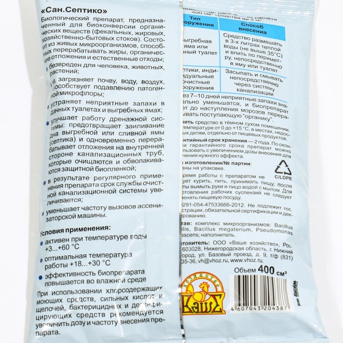 Улучшает работу дренажной системы: предотвращает заиливание дна выгребной или сливной ямы (септика) и одновременно перерабатывает отложения на внутренней стороне канализационных труб, которые очищаются и обволакиваются защитной биопленкой.