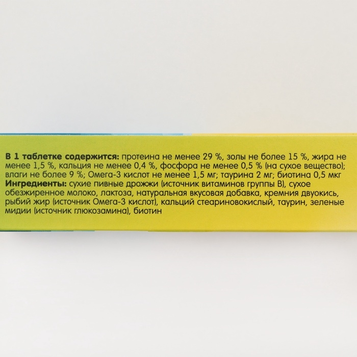 В 1 таблетке содержится: белки 33%, жиры 4%, зольные компоненты, не менее 14%, влага, не более 9%, кальций, не менее 4,1%, фосфор, не менее 1,9%, биотин, 1,0 мкг; таурин 60 мкг; этиловые эфиры незаменимых жирных кислот класса Омега-3, не менее 1,5 мг.