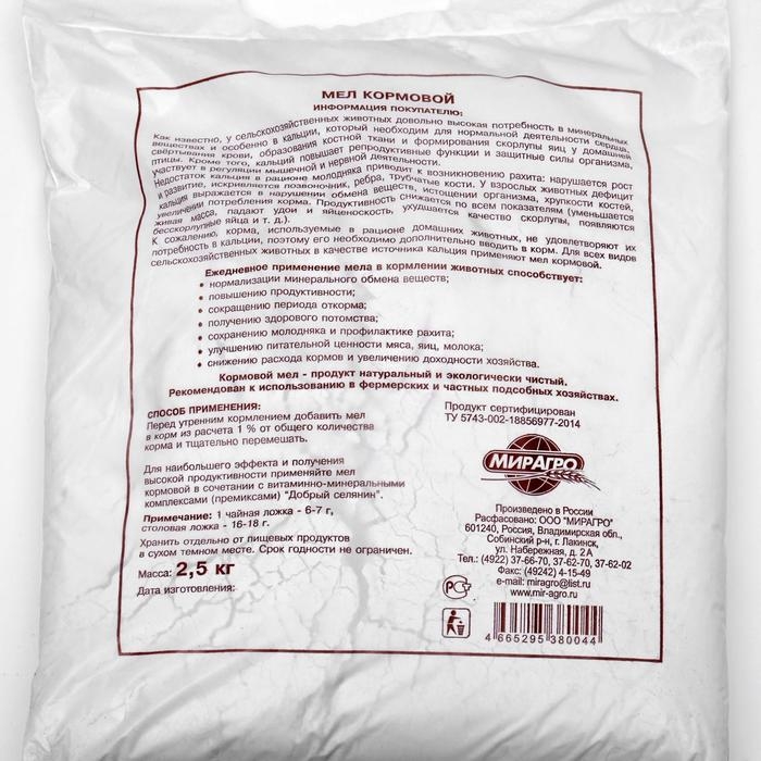 - снижению расходов кормов и увеличению доходности хозяйства.Мел кормовой – продукт натуральный и экологически чистый. Рекомендован к использованию в фермерских и частных подсобных хозяйствах.