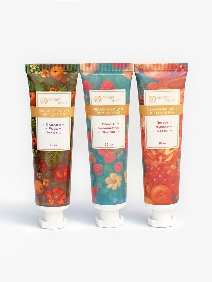 В набор входят увлажняющие крема: Крем для рук «Яблоко, роза, ландыш» 30 мл, Крем для рук «Цветы, фрукты, янтарь» 30 мл, Крем для рук «Малина, белоцветник, фиалки» 30 мл.