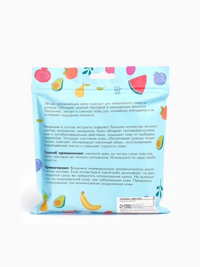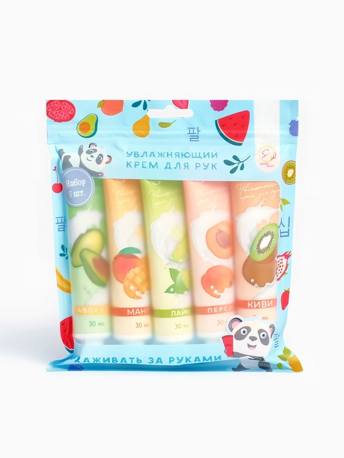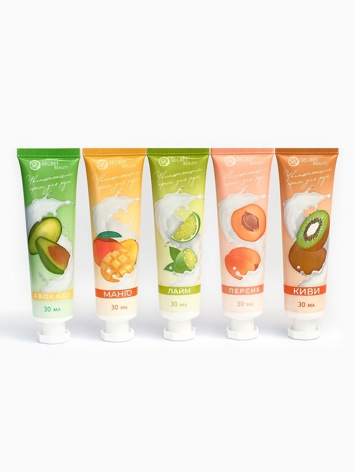 В набор входят увлажняющие крема: Крем для рук «Кокос» 30 мл, Крем для рук «Персик» 30 мл, Крем для рук «Клубника» 30 мл, Крем для рук «Манго» 30 мл, Крем для рук «Виноград» 30 мл.