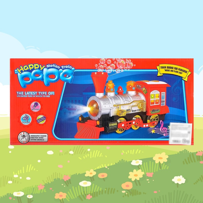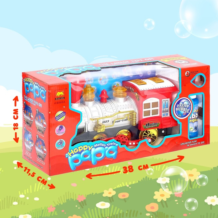 Внимание карапуза привлекут яркие эффекты: во время движения поезда лампочки светятся, а сам локомотив гудит и имитирует стук колёс. Если залить мыльный раствор, игрушка начнёт стрелять мыльными пузырями.