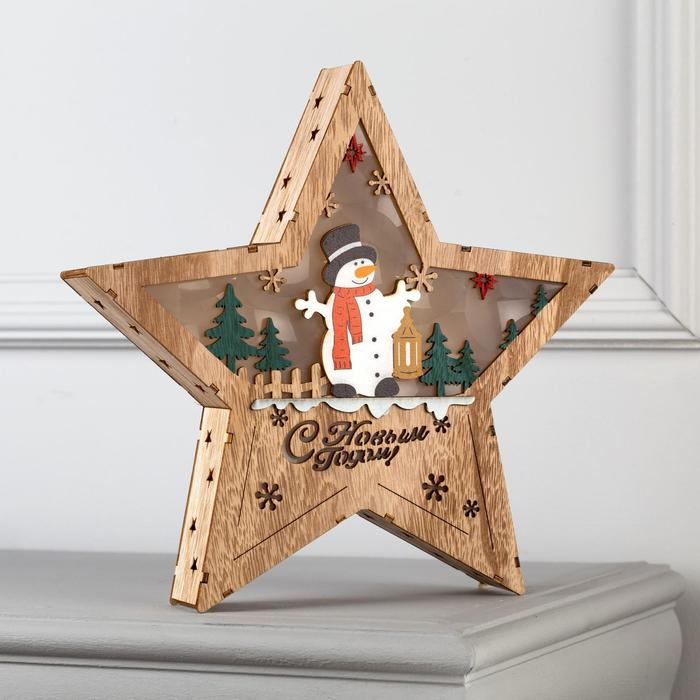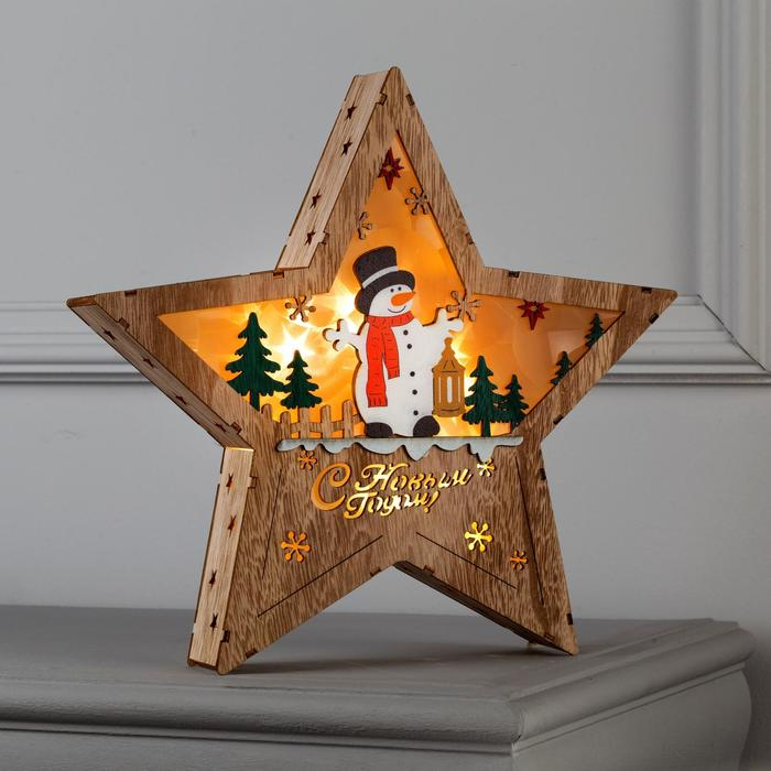 Светодиодная фигура «Звезда со снеговиком» 30 × 30 × 5 см, дерево, батарейки АААх2 (не в комплекте), свечение тёплое белое