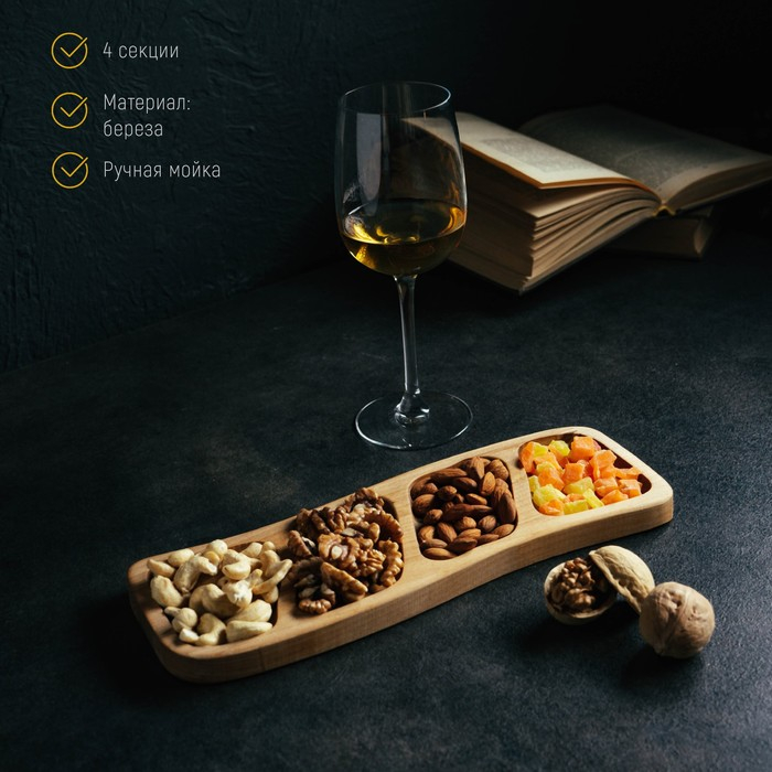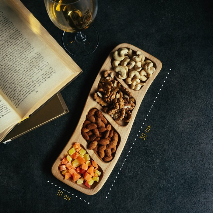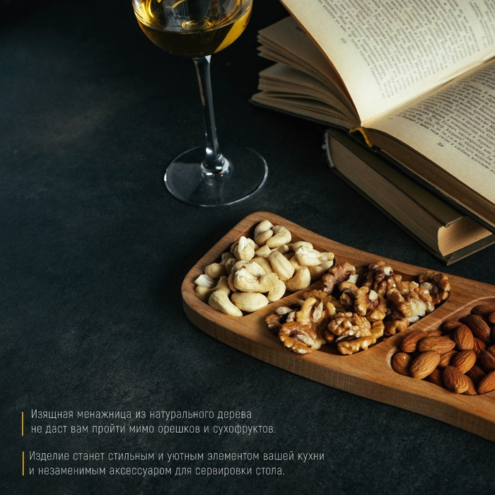 Никак не можете отучить себя от вредных перекусов? Изящная менажница из натурального дерева не даст вам пройти мимо орешков и сухофруктов. Изделие станет стильным и уютным элементом вашей кухни и незаменимым аксессуаром для сервировки стола.