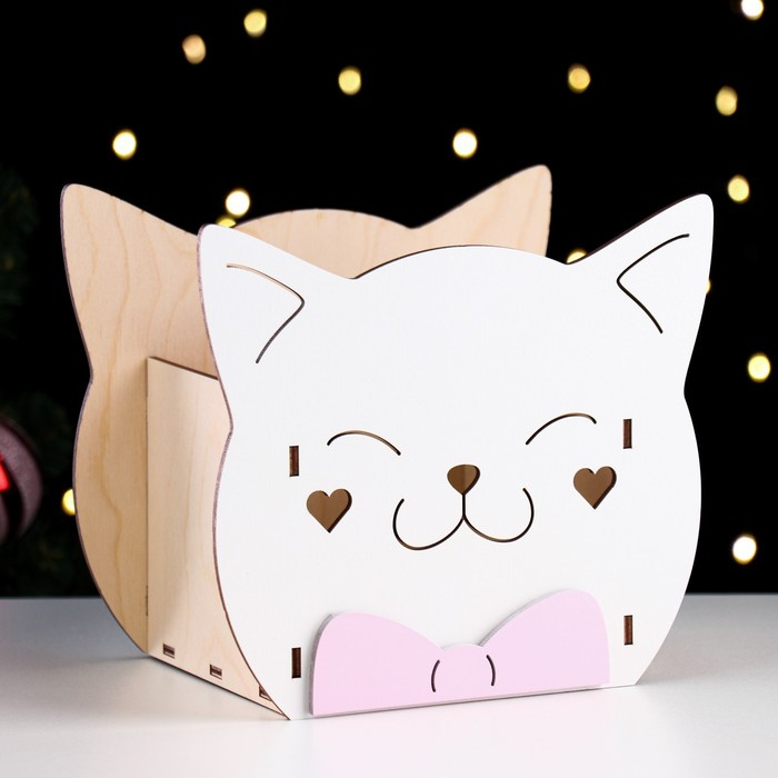 Кашпо деревянное для цветов и подарков "Котик"с аппликацией, белое, 18,8х12,8х16,7 см