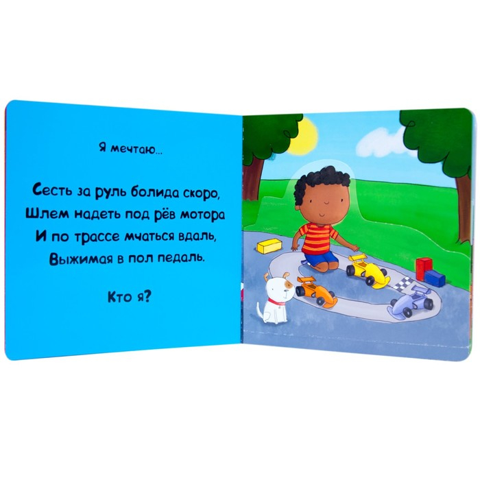 На каждом развороте малыш найдет загадку в стихах, отгадав ее и отогнув клапан, он узнает, кем мечтают стать герои книг, когда вырастут.