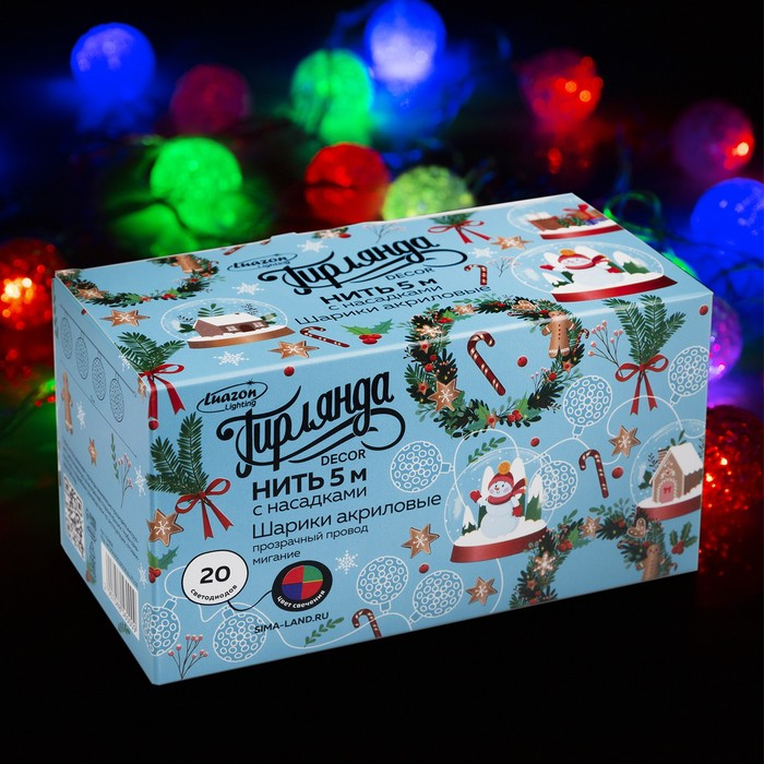Гирлянда «Нить» 5 м с насадками «Шарики акриловые», IP20, прозрачная нить, 20 LED, свечение мульти (RG/RB), мигание, 220 В