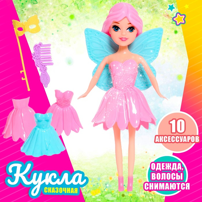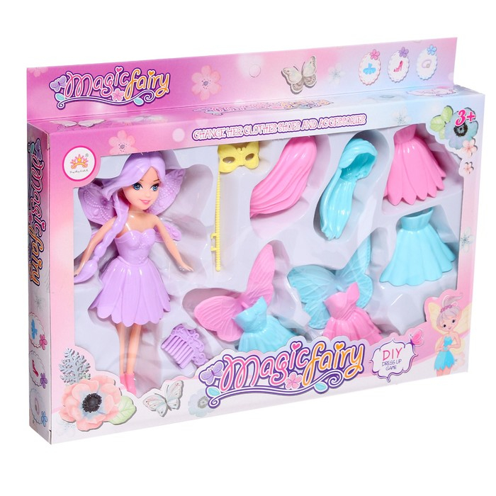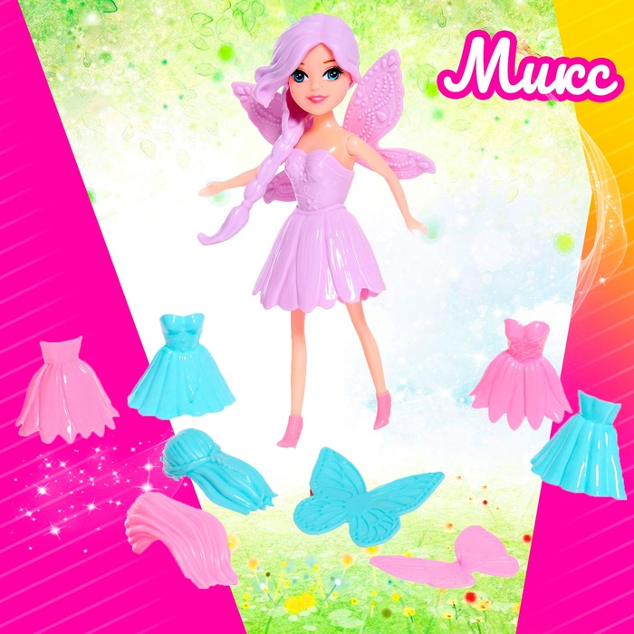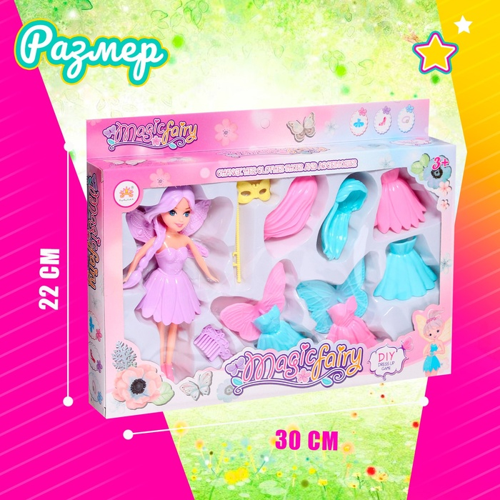 У сказочной феи длинные волосы, много платьев и аксессуаров. Ваша малышка может самостоятельно менять наряды, подбирать образы.