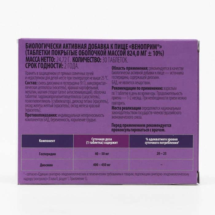 Состав: смесь диосмина и гесперидина (9:1), микрокристаллическая целлюлоза, крахмал картофельный, желатин, магния стеарат (агент антислёживающий), оболочка таблетки: гидроксипропилметилцеллюлоза (загуститель), полиэтиленгликоль (стабилизатор), диоксид титана (краситель), оксид железа, оксид железа красный.