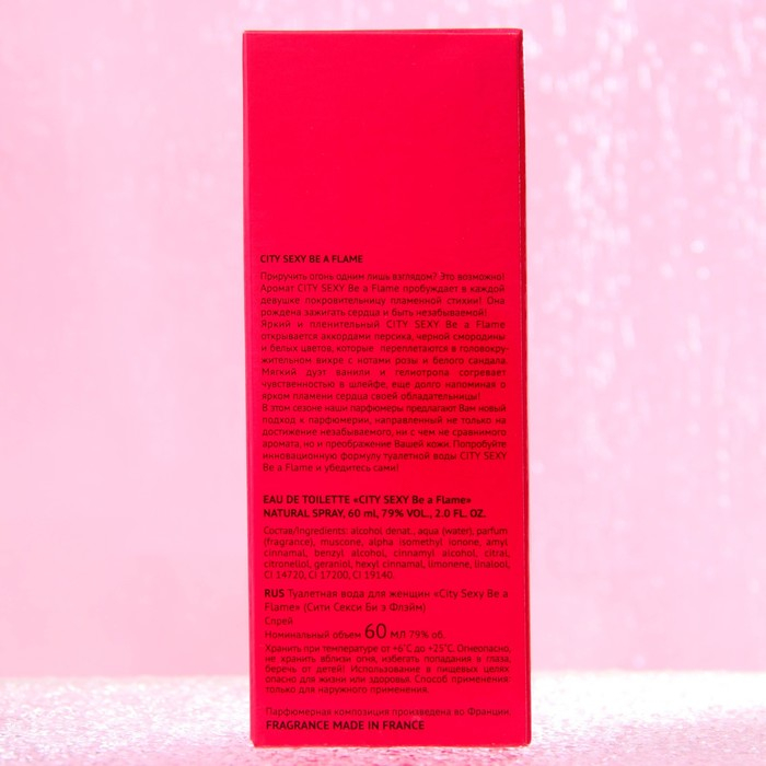 О девушке City Sexy Be a Flame ходят легенды… Её эмоции горячие, взгляд обжигающий. Она зажигает сердца и притягивает восторженные взгляды. После нее в воздухе еще долго царит теплый согревающий шлейф, напоминая о горячем пламени ее сердца. Сочетание мякоти персика, белых цветов и чёрной смородины в пламени начальных нот согревают, дополняя образ акватическим аккордом, розой и сандалом в сердце. Шлейф из мускуса, ванили и гелиотропа обжигает и одновременно рождает невероятную магию притяжения.