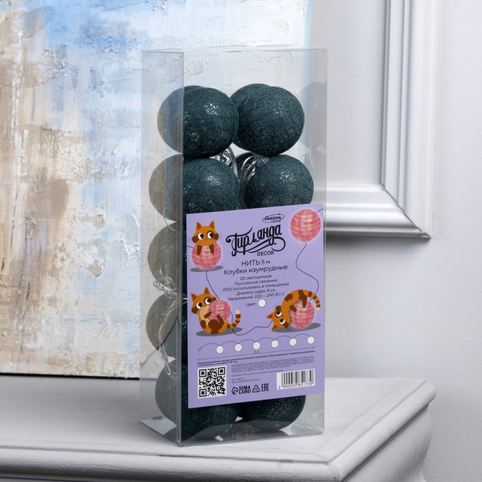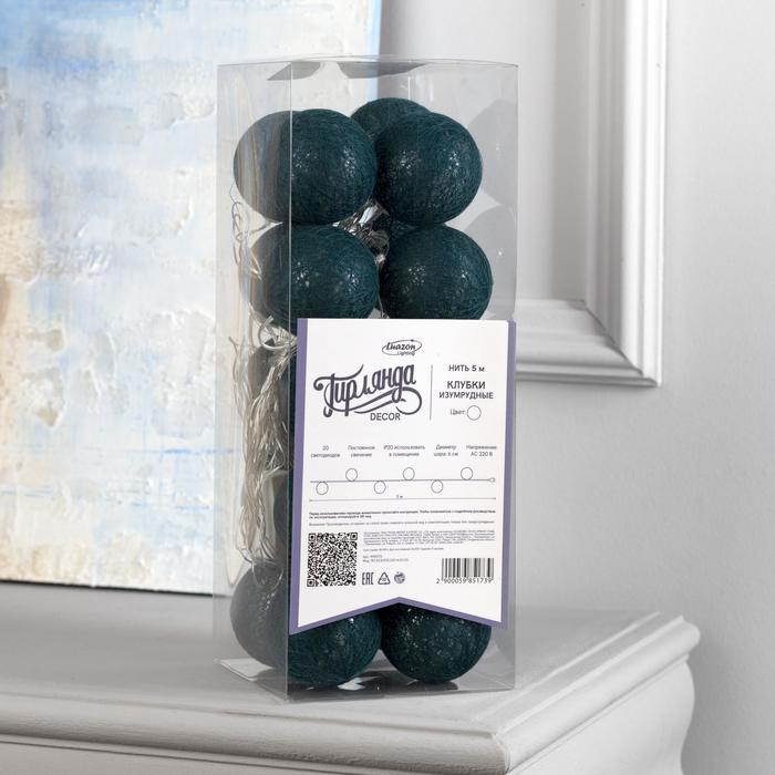 Гирлянда «Нить» 5 м с насадками «Клубки изумрудные», IP20, прозрачная нить, 20 LED, свечение белое, 220 В