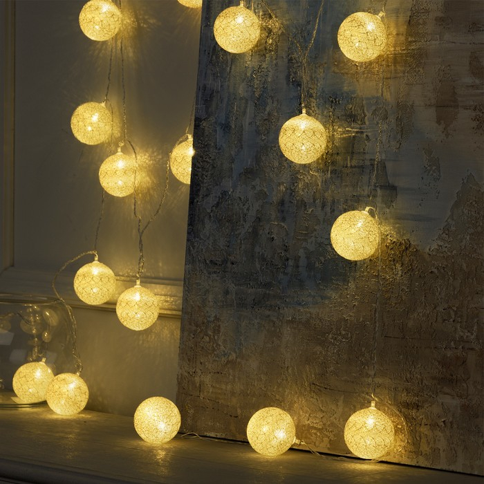Светодиодная гирлянда с шариками из ниток станет прекрасным решением для создания праздничной атмосферы и уюта в интерьере. Она украсит карниз в спальне, стены в детской, фотозону или даже офисное помещение. Также гирлянда может служить отличным ночником для вашего малыша, а в спальне добавит интерьеру нежных красок и мягкий свет.