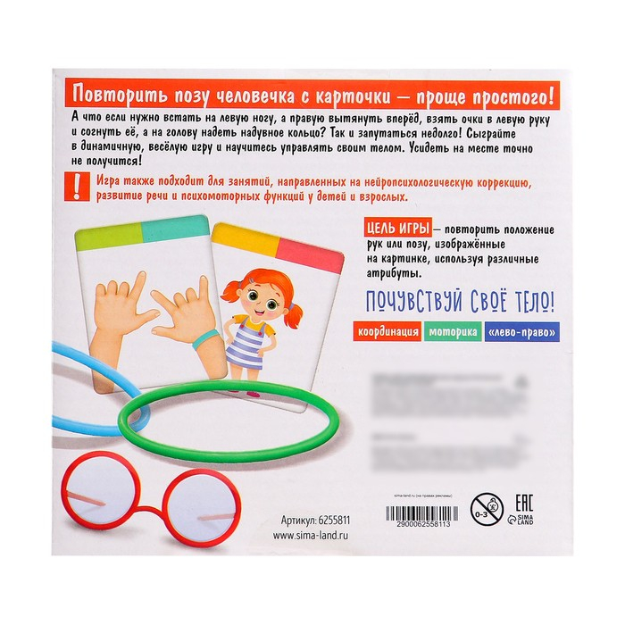 Игра способствует развитию у ребёнка моторики, координации и обучает понятиям «право-лево». Занятия направлены на нейропсихологическую коррекцию, развитие речи и психомоторных функций у детей. Рекомендовано детям старше 4 лет и рассчитано на 2–4 участников.