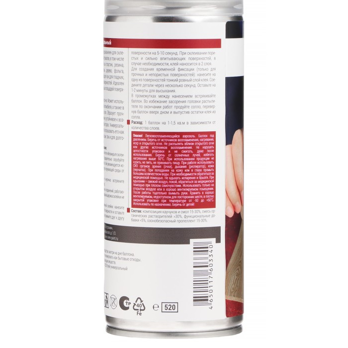 Аэрозольный клей предназначен для склеивания различных материалов, в том числе между собой, таких как пластик, резина, металл, стекло, ткань, дерево, фольга, картон и другие. Подходит как для гладких, так и для пористых поверхностей. Идеален для склеивания больших площадей поверхности. Склеивает быстро и прочно. Может использоваться в быту, для автомобиля, а также в профессиональных целях. Образует прочное и гибкое соединение, устойчивое к воздействию внешних факторов. Универсальность клея позволяет использовать его как для временной фиксации, так и для долговременных склеек.