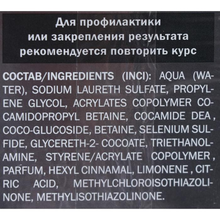 Состав: Aqua (Water), Sodium Laureth Sulfate, Propylene Glycol, Acrylates Copolymer Cocamidopropyl Betaine, Cocamide DEA, Coco-Glucoside, Betaine, Selenium Sulfide, Glycereth-2- Cocoate, Triethanolamine, Styrene/Acrylate Copolymer, Parfum, Hexyl Cinnamal, Limonene , Citric acid, Methylchloroisothiazolinone, Methylisothiazolinone.