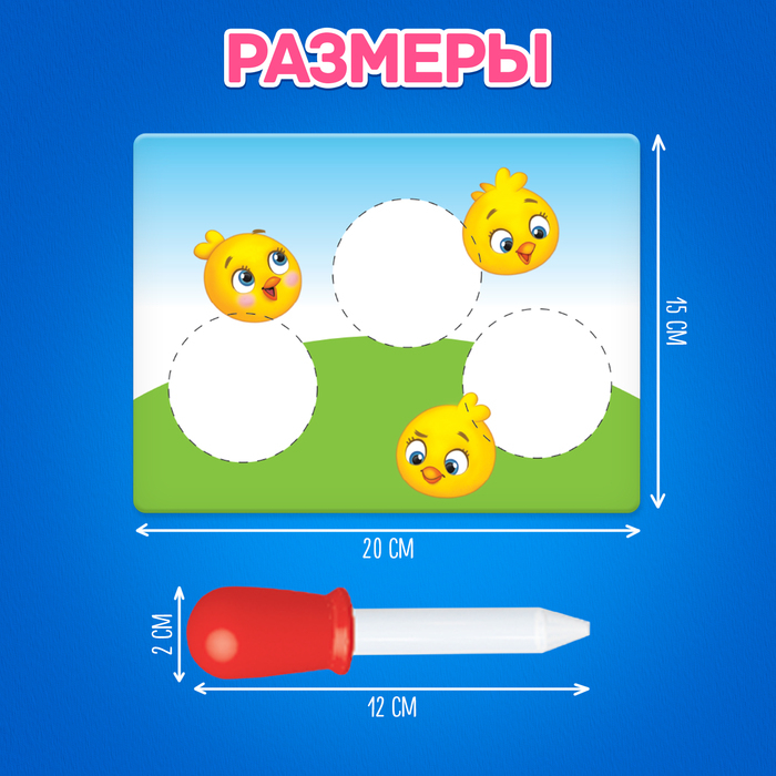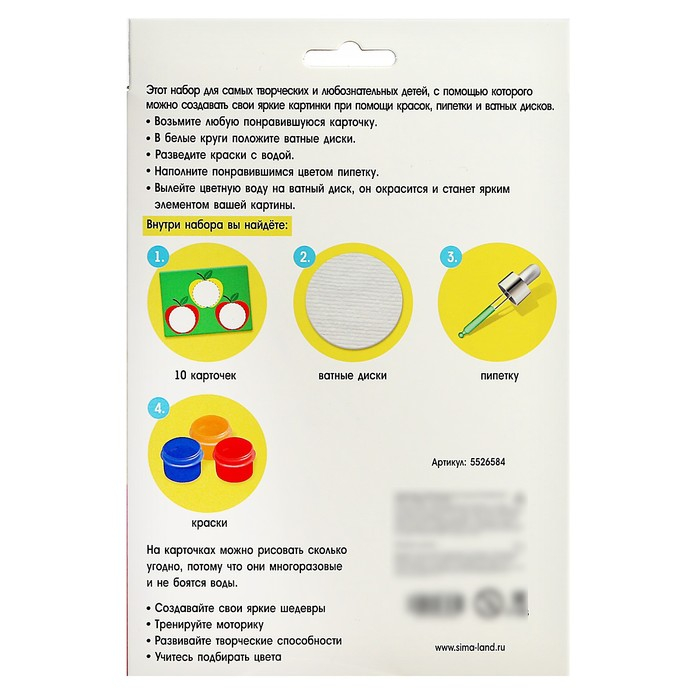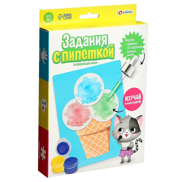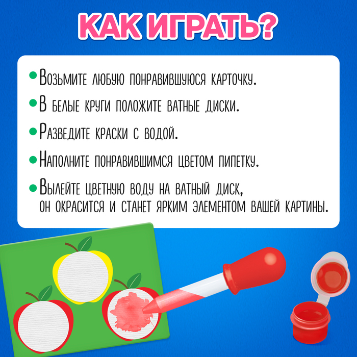 Этот набор предназначен для творческих и любознательных малышей. Ребёнок будет создавать яркие картинки с помощью пипетки, ватных дисков и красок. Набор поможет малышу развить моторику, мышление и логику.