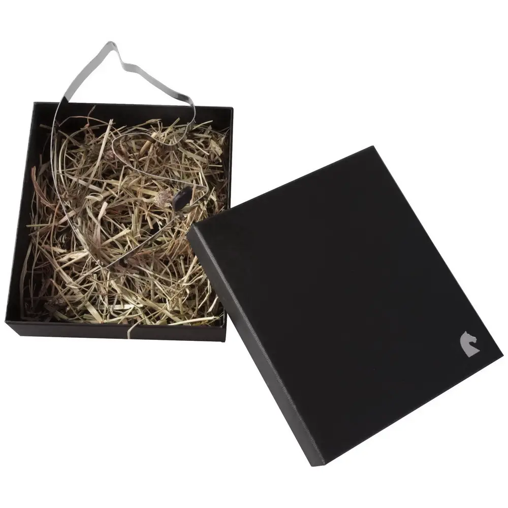 - дополнена дизайнерской упаковкой с оригинальным наполнителем — экологически чистым сеном