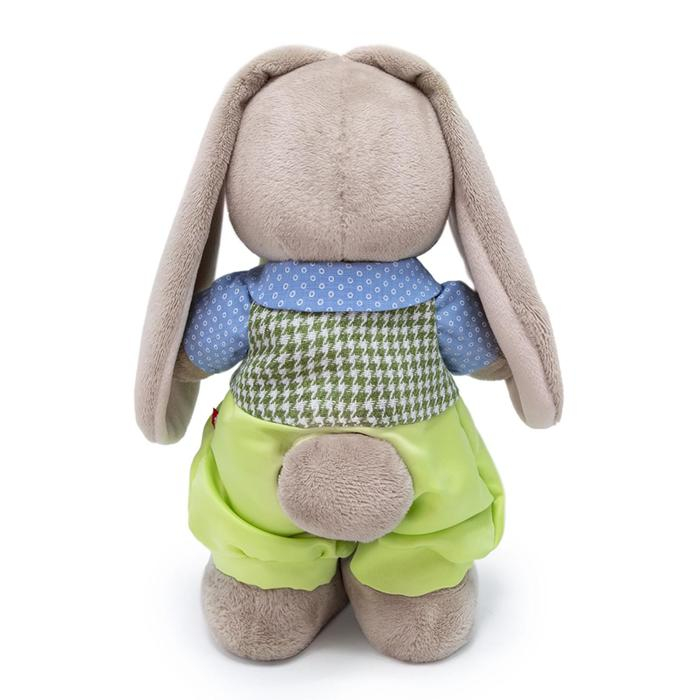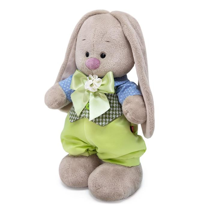 Милая мягкая игрушка «Зайка Ми» — это хороший подарок для ребёнка или кукольного коллекционера. Зайка одета в праздничный комплект, состоящий из широких штанов салатового цвета, голубой рубашки и жилета с зелёным клетчатым узором. Объёмный бант дополняет образ. Одежду с игрушки можно снять.