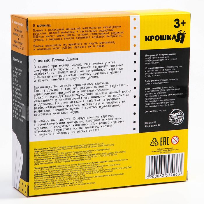 В наборе вы найдете 15 двусторонних карточек с геометрическими фигурами, простыми и сложными узорами, с силуэтами животных. Прикрепите карточки к мобилю, разместите их на кроватке, коляске и позвольте малышу их рассматривать.