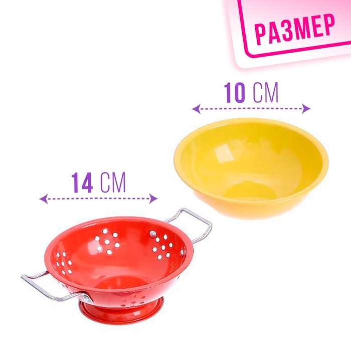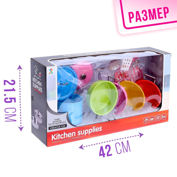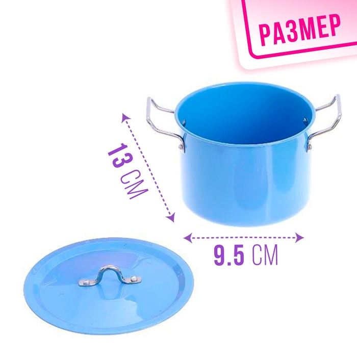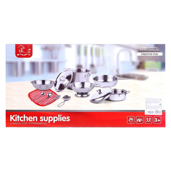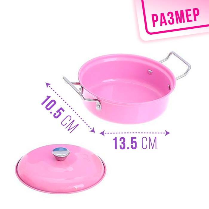 Набор металлической посуды — альтернатива взрослой кухонной утвари. В процессе игры малышка сможет абсолютно безопасно пользоваться принадлежностями для готовки: они лёгкие, простые в использовании, их размеры рассчитаны на ребёнка. Дочурка с удовольствием будет баловать свои игрушки кулинарными шедеврами, перенимая мамины рецепты.