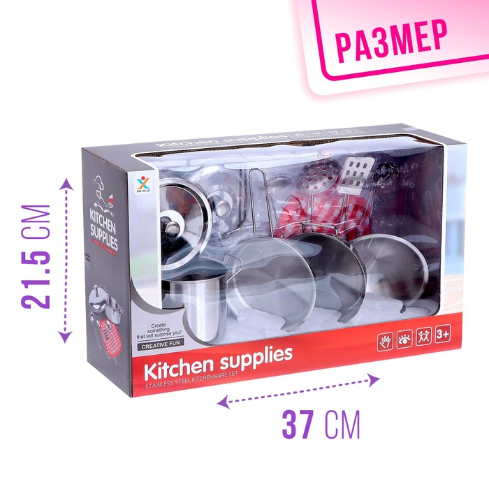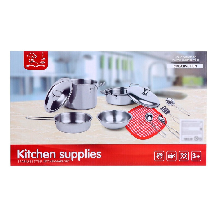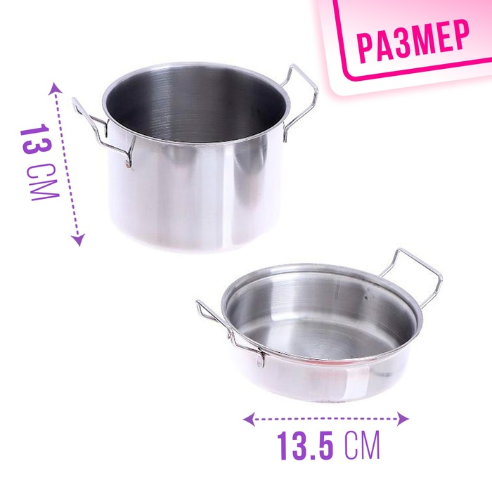 Набор металлической посуды — альтернатива взрослой кухонной утвари. В процессе игры малышка сможет абсолютно безопасно пользоваться принадлежностями для готовки: они лёгкие, простые в использовании, их размеры рассчитаны на ребёнка. Дочурка с удовольствием будет баловать свои игрушки кулинарными шедеврами, перенимая мамины рецепты.