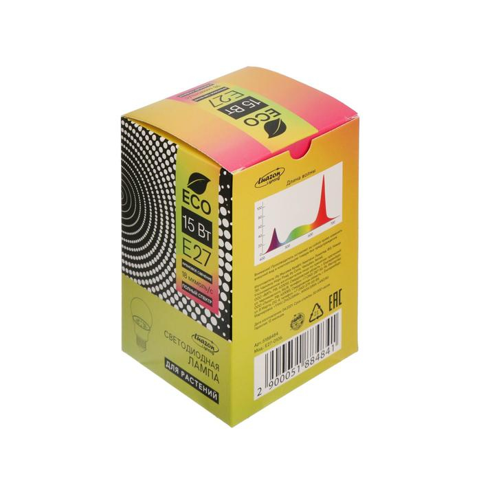 Фитолампа светодиодная Luazon, А60, E27, 15 Вт, IP44, 220 В, 270°, мультиспектральная