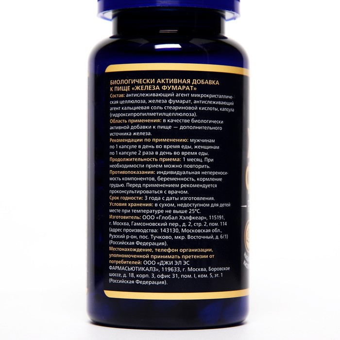 1 вегетарианская капсула (суточная доза для мужчин) содержит: железа фумарат — 60 мг. (в т.ч. железа 20 мг.);