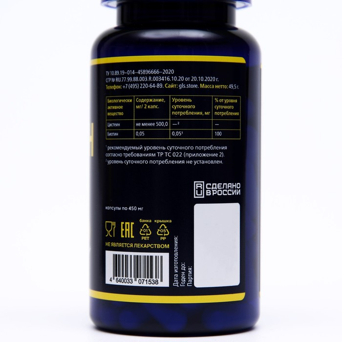 Состав: цистеин гидрохлорид, антислеживающий агент кальциевая соль стеариновой кислоты, биотин, капсула (гидроксипропилметилцеллюлоза).