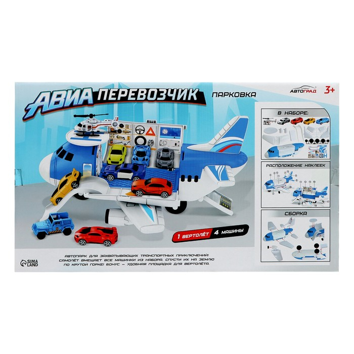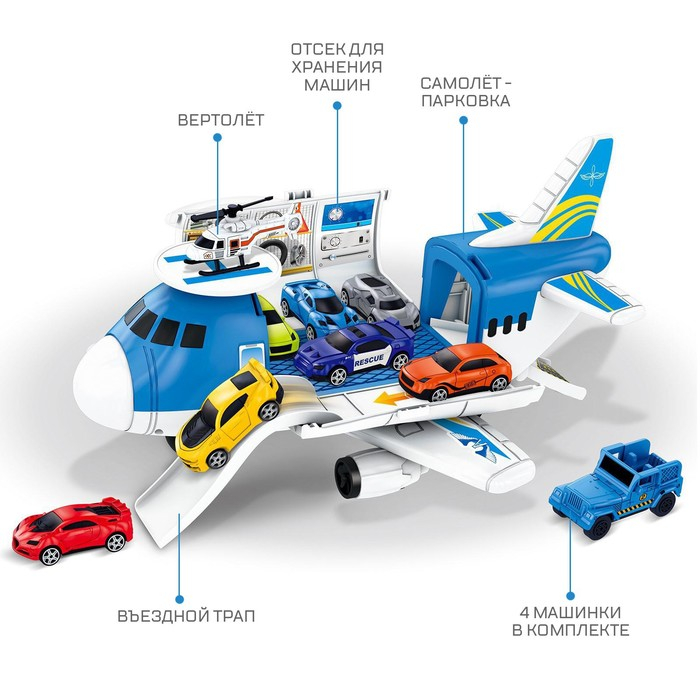 Самолёт-парковка «Авиабаза» с 4 машинками и вертолётом — это увлекательная игрушка для мальчиков от 3 лет. Машинки легко проедут на парковку благодаря горке-трапу. Для посадки вертолёта оборудована специальная возвышенность — вертодром, что позволит малышу безопасно посадить летательный аппарат и не мешать парковаться другим автомобилям. Яркая и красочная игрушка изготовлена из прочного пластика. Самолёт привлечет внимание ребёнка и порадует его.