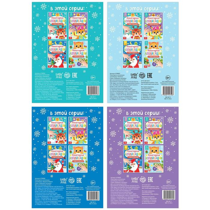 В наборе 4 книги, в каждой из них вас внутри ждут целых 8 картинок! А готовые аппликации станут чудесным новогодним подарком для близких крохи!