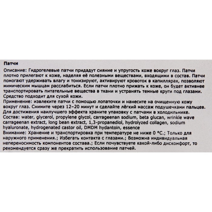 Гидрогелевые патчи придадут сияние и упругость коже вокруг глаз. Патчи плотно прилегают к коже, наделяя её полезными веществами, входящими в состав. Они помогают удерживать влагу и тонизируют, активируют кровоток в капиллярах, позволяют мимическим мышцам расслабиться. Если патчи плотно прижать к коже, они будут активнее транспортировать питательные вещества в ткани и устранять темные круги под глазами. Средство подходит для сухой кожи.