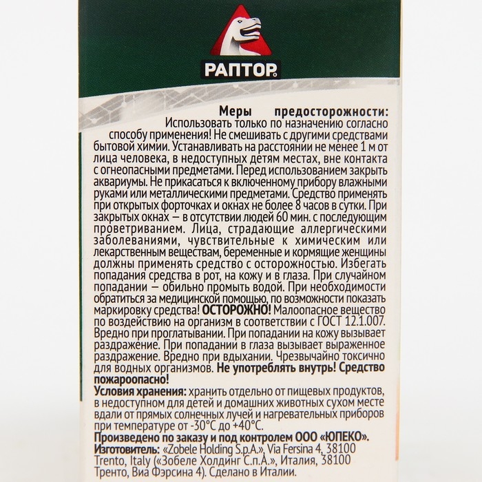 Эффективная и бережная БИО-защита от комаров для всей семьи!В состав жидкости входит Pyrethrum (пиретрум) - натуральный экстракт ромашки.Подходит для людей с повышенной чувствительностью к химическим компонентам.Без запаха.ПоказанияЖидкость для фумигатора для уничтожения комаров в помещении.ПротивопоказанияИндивидуальная непереносимость компонентов.Особые указанияСредство применять в хорошо проветриваемых помещениях или при открытых форточках и окнах не более 8 часов при непрерывной работе прибора; в закрытых помещениях не более 2 часов в отсутствии людей с последующим проветриванием.Не касаться включенного прибора влажными руками и металлическими предметами.Включать прибор на расстоянии не менее 1 м от человека.Хранить отдельно от пищевых продуктов в месте, недоступном для детей и домашних животных.Лица, страдающие аллергическими заболеваниями, должны применять средство с осторожностью.При появлении дискомфортных ощущений прекратить использование средства и проветрить помещение.Закрыть аквариум на время работы прибора.ОСТОРОЖНО! Средство относится к малоопасным препаратам по воздействию на организм.Средство обладает раздражающим действием на слизистые оболочки глаз.Средство пожароопасно.Способ применения и дозировкаСнимите колпачок с флакона, вставьте стержень в прибор РАПТОР и плотно прикрутите. Включите прибор в электросеть (220 В), поверните вилку прибора так, чтобы флакон располагался вертикально. Жидкостный наполнитель начинает действовать через 10-15 минут после включения. Полное уничтожение комаров достигается через 20-25 минут. После окончания работы выключите прибор из сети. Жидкость можно использовать до полного испарения из флакона.СоставЭток (праллетрин) - 0,9%; отдушка; стабилизатор; растворители.