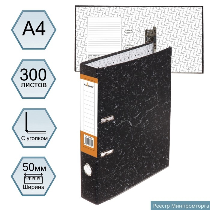 Папка-регистратор Calligrata эконом, формата А4+ – отличный помощник для хранения и систематизации документов. Ширина корешка – 50 мм. Папка чёрного цвета вмещает до 300 листов стандартной плотности. Размер – 290 х 320 х 50 мм. Папка-регистратор с вертикальной ориентацией выполнена из твёрдого картона толщиной 1,5 мм и имеет внешнее покрытие из офсетной бумаги «мрамор». Внутренняя часть папки также выполнена из офсетной бумаги. Изделие имеет металлический арочный механизм и поставляется в собранном виде, а на нижней грани есть металлическая окантовка.