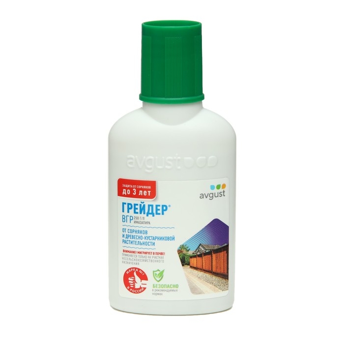 Грейдер - системный гербицид сплошного действия для уничтожения всех видов нежелательной травянистой и древесной растительности. Применяется на землях несельскохозяйственного назначения.Препараты от сорной растительности обладают ограниченным сроком действия. Такие свойства вполне оправданы и необходимы для того, чтобы после очистки территорий была возможность что-то на них посадить. Но бывают ситуации, когда нужно освободить участок под постройку дома или, например, избавиться от сорняков на погосте на длительное время. Здесь на помощь и приходит Грейдер. Он уничтожает все виды нежелательной травянистой и древесно-кустарниковой растительности, ему подвластны даже злостные и карантинные сорняки, в том числе амброзия полыннолистная. Также Грейдер легко справляется с лиственной и хвойной порослью, например, осиной, березой, ольхой, ивой, сосной, елью и др. Препарат обладает высокой почвенной активностью и уничтожает не только существующие сорняки, но и новые всходы на срок до 3-х лет (в зависимости от нормы расхода, количества сорняков, типа почвы и др.). Уже через час после обработки гербицид не смывается дождем, результативен при широком диапазоне температур. Несмотря на то, что Грейдер малотоксичен для млекопитающих, птиц и пчел, подходить к его применению нужно со всей ответственностью, дабы не уничтожить полезные культуры. Не проводите обработку ближе нескольких метров к таким растениям, препарат имеет умеренную миграцию в почве, поэтому способен негативно повлиять на их развитие. При использовании препарата важно четко следовать инструкции и не превышать допустимых норм. Тогда Грейдер станет незаменимым помощником для борьбы с сорняками на непосевных территориях.В течение первых суток после обработки прекращается рост и развитие растений. Видимые признаки повреждений проявляются через 7-14 дней в виде обесцвечивания и побурения точек роста. Полная гибель травянистой растительности наступает через 1-2 месяца, древесно-кустарниковой – через 2-3 месяца. Мощное средство длительного действия против любой растительности.Полное уничтожение всех видов сорняков даже самых злостных и нежелательной древесно-кустарниковой растительности.Защищает на срок до 3 лет.Действует на надземную часть сорняков и их корневую систему.Устойчив к смыванию дождём уже через час после обработки. Действующее вещество: 250 г/л имазапира.Препаративная форма: ВГР - водно-гликолевый раствор.Производитель: АО Фирма «Август», Россия.Фасовка: 10 мл, 50 мл, 100 мл, 500 мл (флакон).Срок годности: 4 года.
