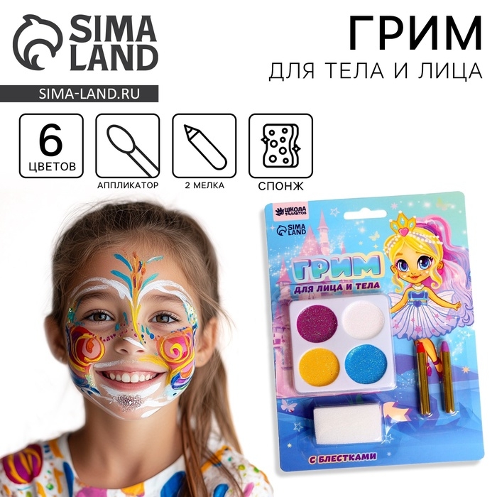 Грим для лица — это декоративная косметика, которая позволит ребёнку мгновенно перевоплотиться в персонажа на свой вкус. А взрослые с его помощью смогут создать неповторимый образ для любого праздничного случая: дня рождения, Хеллоуина, Дня России или тематической вечеринки. В набор входят блёстки для создания уникального и стильного рисунка. Набор состоит из 2 цветных карандашей и 4 ярких красок.