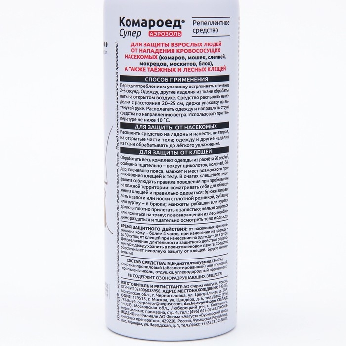 Назначение: для защиты людей от нападения кровососущих насекомых (комаров, мошек, слепней, мокрецов, москитов, блох), таежных и лесных клещей при нанесении на открытые части тела, одежду, занавеси, сетки и другие изделия из ткани.