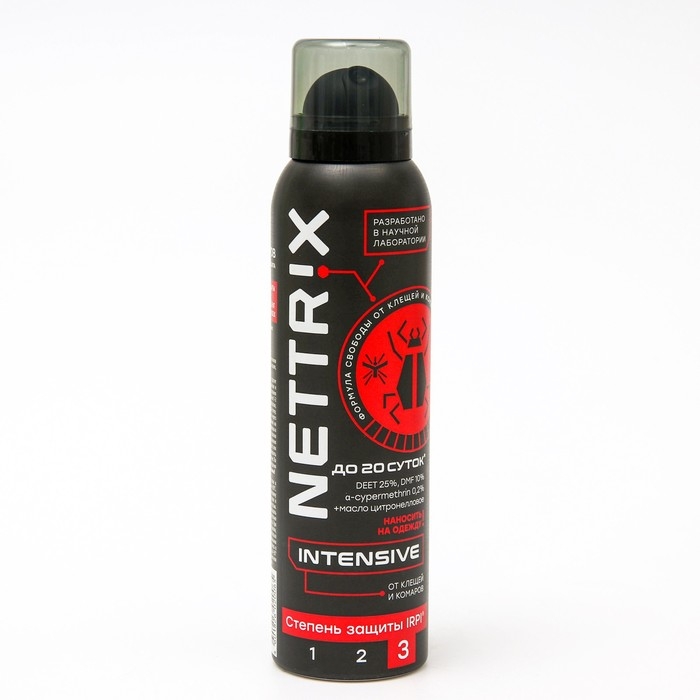 Nettrix Intensive - защита взрослых и детей с 3 лет от таежных и лесных клещей (переносчиков возбудителей клещевого энцефалита и боррелиоза) и кровососущих насекомых (комаров, мошек, мокрецов, слепней, москитов, блох). Наносится только на одежду и снаряжение.