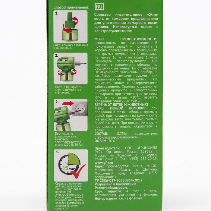 Жидкостный наполнитель 30 ночей. Жидкостный наполнитель для фумигатора - универсальное и удобное в использовании средство для борьбы с комарами. В помещении общим объемом около 60 кубических метров средство начинает работать уже через 15 минут. Для полного уничтожения комаров требуется приблизительно не более 1 часа. Отвинтить у флакона пластмассовую крышку, вставить стержень внутрь фумигатора и закрепить до упора. Включить прибор в электрическую сеть (220В) так, чтобы флакон находился в вертикальном положении. Полная гибель насекомых достигается за 15-60 минут в зависимости от вида и площади помещения. Состав: трансфлутрин, стабилизатор, растворитель