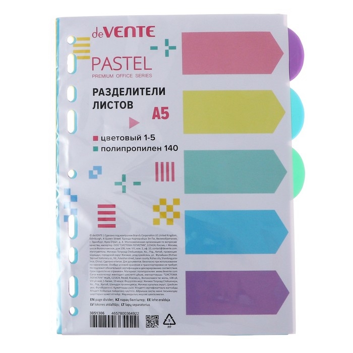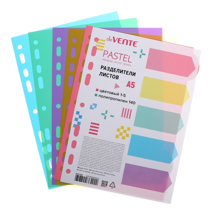 Разделитель листов A5 (210 x 165 мм) цветовой, 5 листов, "deVENTE. Pastel" полипропилен 140 мкм, индивидуальная упаковка