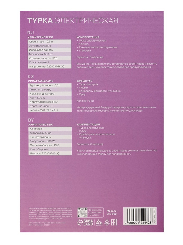 Турка электрическая Luazon LTE-602, 600 Вт, 300 мл, автоотключение, сиреневая