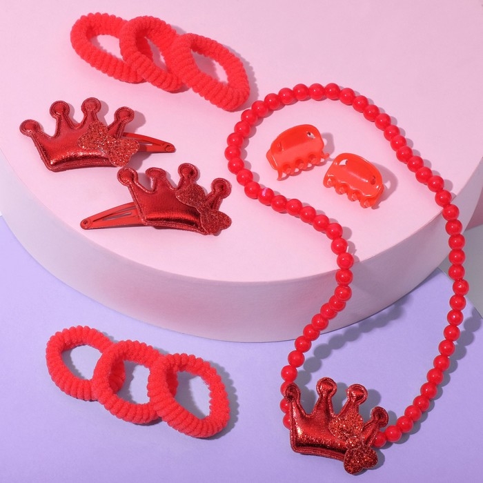 Набор детский«Выбражулька»12 пред-тов:4 заколки,6 резинок,бусы,корона, цвет красный