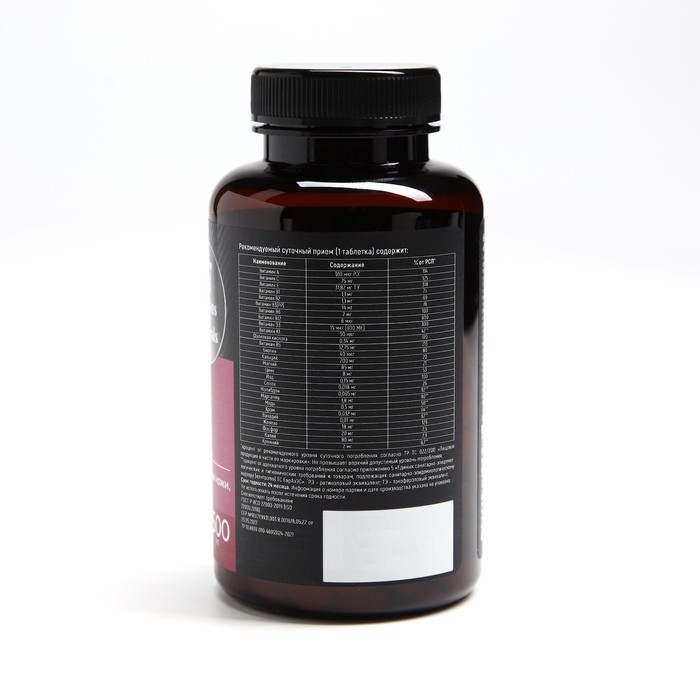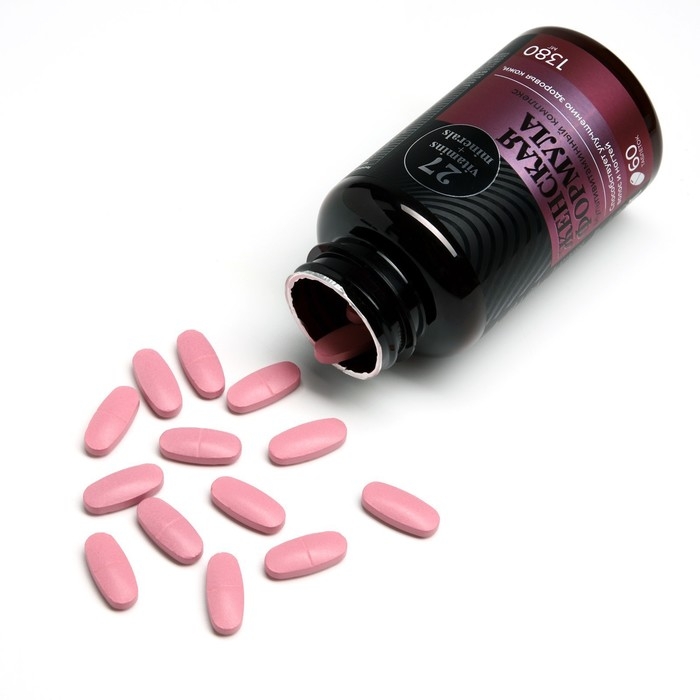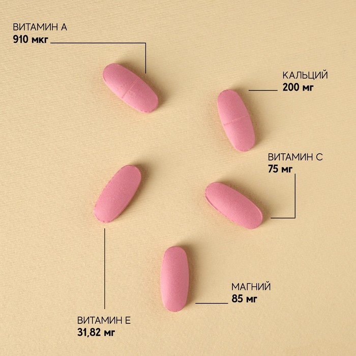 Состав: карбонат кальция, микрокристалическая целлюлоза - носитель, хлорид калия, оксид магния, токофорелла ацетат, фосфат кальция, аскорбиновая кислота, поливинилпирроопидон - загуститель, фуарат железа, крахмал, обработанный щелочью - стабилизатор, D- пантотенов кальция, ниацинамид, магневая соль стеариновой кислоты - эмульгатор, покрытие таблетки (гидроксипропилметилцеллюлоза, диоксид титана - краситель, тальк - агент антислеживающий, полиэтиленгликоль - глазировать, кармины - краситель, синий блестящий FCF - краситель), ретинола ацетат, сульфат меди, оксид цинка, сульфат марганца, холекальциферол, хлорид хрома, фолиевая кислота, селенит натрия, пиридоксина гидрохлорид, диоксид кремния, тиамина мононитрат, рибофлавин, йодид калия, биотин, цианокобаламин, фиплохинон, молибден натрия, метаванадат натрия.