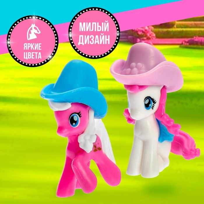 Эти яркие и милые пони в шляпах станут прекрасным дополнением к коллекции игрушек вашего ребёнка. Каждая фигурка изготовлена из универсального пластика и отличается высоким качеством исполнения.