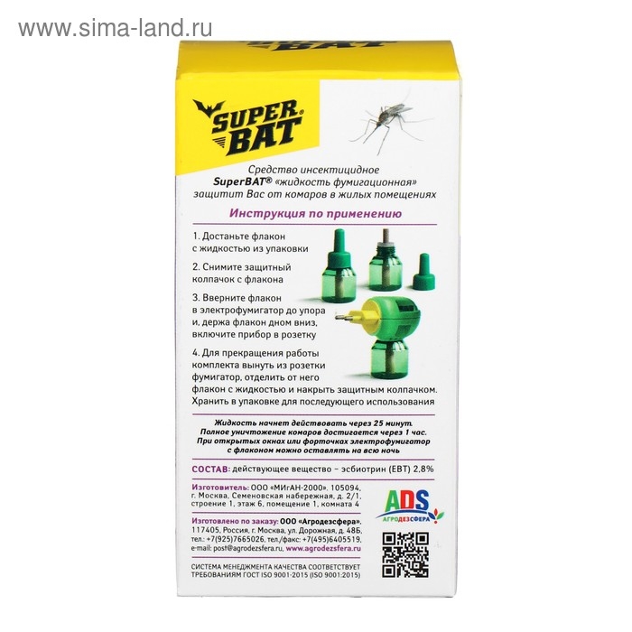Дополнительный флакон к электрофумигатору для уничтожения комаров в помещениях. Увеличенный объем избавляет от насекомых на 60 ночей!При использовании универсального электрического фумигатора «SuperBat», достаньте из коробки флакон с жидкостью от комаров «SuperBat», отверните защитный колпачок.Вставьте флакон в электрический фумигатор «SuperBat» и плотно прикрутите.Включите прибор в электросеть, поверните вилку прибора так, чтобы флакон располагался вертикально.При использовании противомоскитной пластины вынуть ее из упаковки и вложить в электрический фумигатор «SuperBat». Вилку повернуть согласно розетке и включить прибор в электросеть на 220 Вольт.Средство начинает действовать через 10-15 минут после включения.Уничтожение комаров достигается за 1-2 часа.При открытых на ночь окнах и форточках электрический фумигатор «SuperBat» с флаконом или пластиной оставьте включенным на всю ночь для уничтожения залетающих комаров.Запрещается одновременное применение флакона с жидкостью и пластины.Составпраллетрин 0,7%,растворитель,стабилизатор