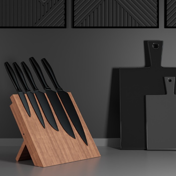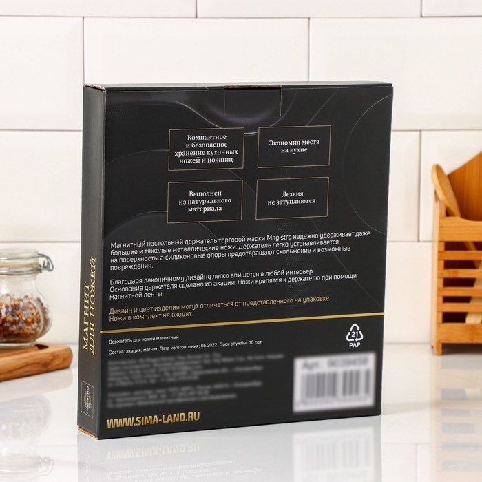 Магнитный держатель - это стильное современное решение для экономии места на вашей кухне! Основание держателя сделано из акации. Изделие имеет силиконовые опоры, которые предотвращают скольжение и защищают поверхность от возможных повреждений. Рекомендуем протирать ножи после мытья, затем крепить их на магнитную ленту. Держатель для ножей сохранит остроту лезвия и добавит уюта на вашу кухню.