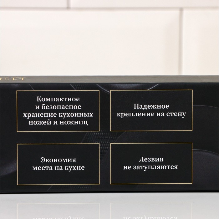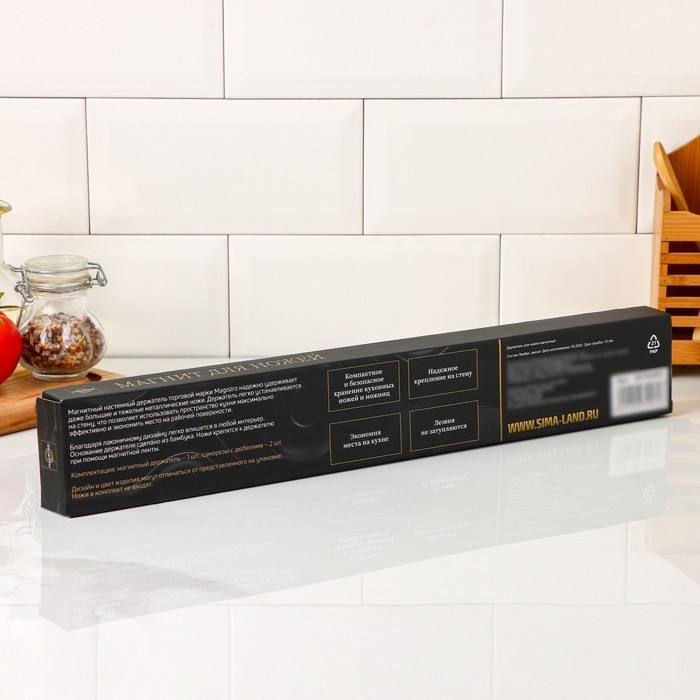 Магнитный настенный держатель - это стильное современное решение для экономии места на вашей кухне! Изделие легко крепится на стену с помощью саморезов, которые идут в комплекте. Основание держателя сделано из бамбука. Рекомендуем протирать ножи после мытья, затем крепить их на магнитную ленту. Держатель для ножей сохранит остроту лезвия и добавит уюта на вашу кухню.