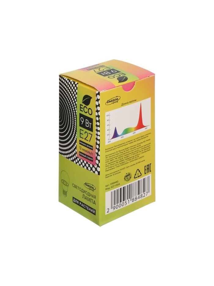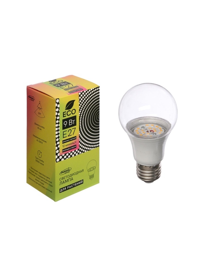 Фитолампа для растений Luazon, светодиодная, А60, E27, 9 Вт, IP44, 220 В, 270°, полноспектральная