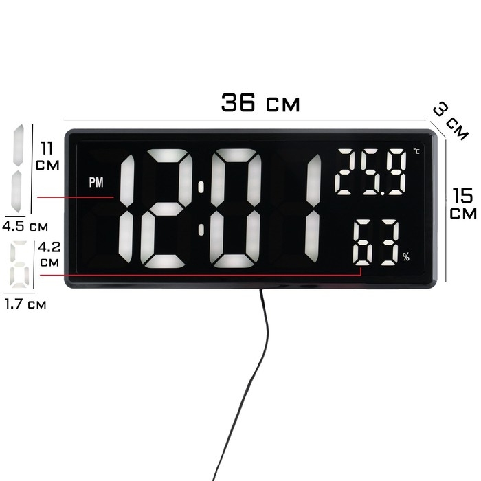 Часы электронные настенные, настольные, с будильником, 15 x 36 x 3 см, USB