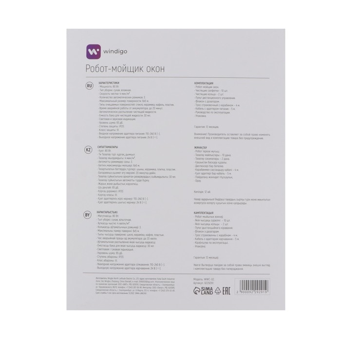 Робот-мойщик окон Windigo WWC-02, 80 Вт, 2 типа уборки, 4 мин/м2, распылитель, АКБ, белый